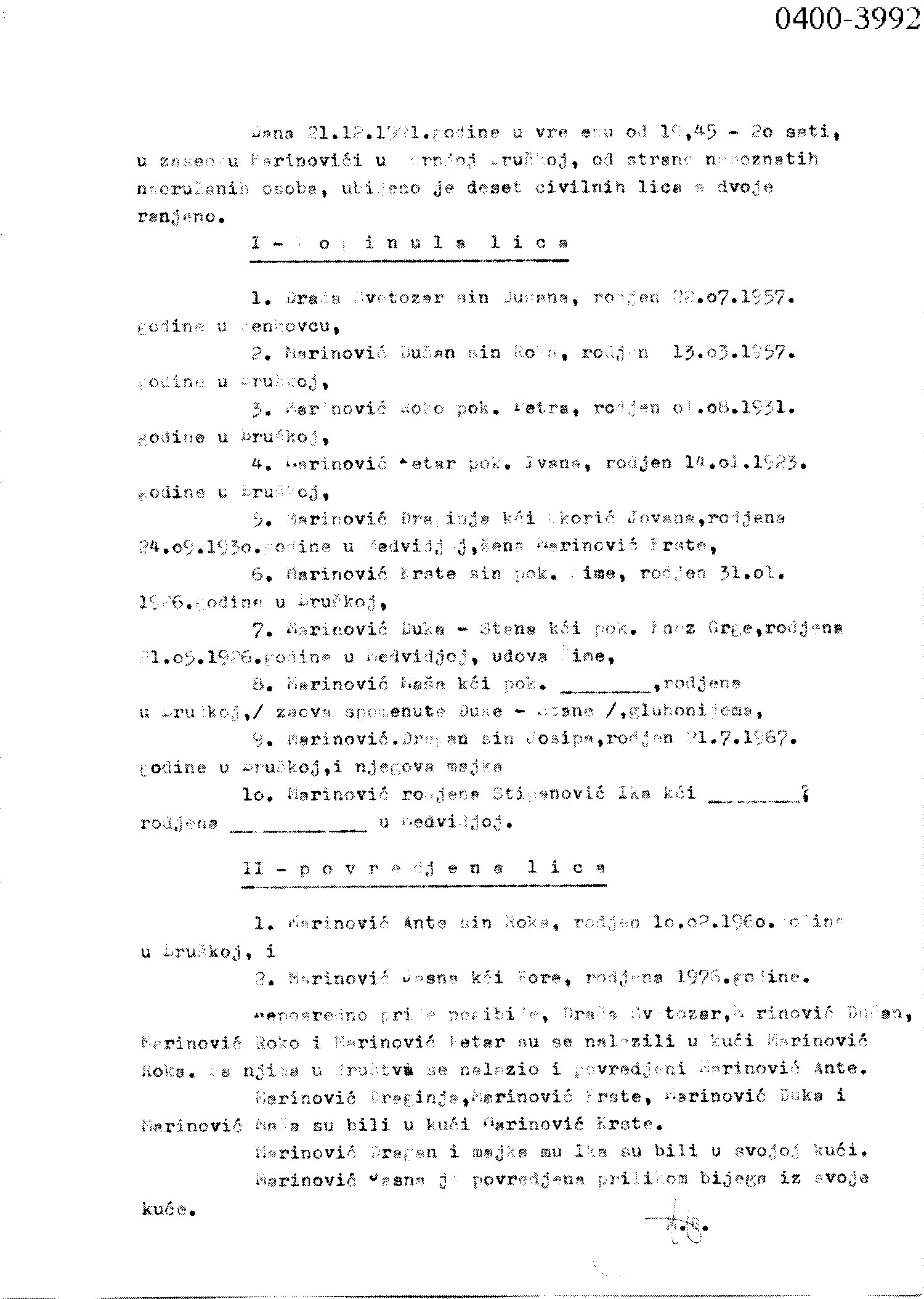 Jasna se preziva Denona, djevojačko joj je prezime Marinović i Hrvatica je. Od desetoro ubijenih u Marinovićima, devetoro su Hrvati, a jedan je Srbin koji se tu slučajno zatekao. Počinitelji zločina su srpski specijalci iz redova Milicije „Krajine“, poznati kao "martićevci". Zločin se dogodio skoro četiri godine prije operacije Oluja - 21. prosinca 1991. godine.